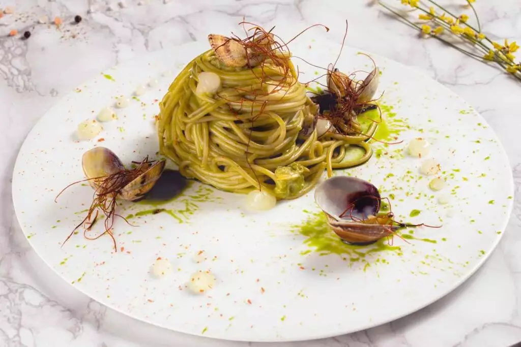 Tagliolini al Granchio: Pasta fresca all’uovo con granchio di mare, pomodorini confit e una spruzzata di limone.