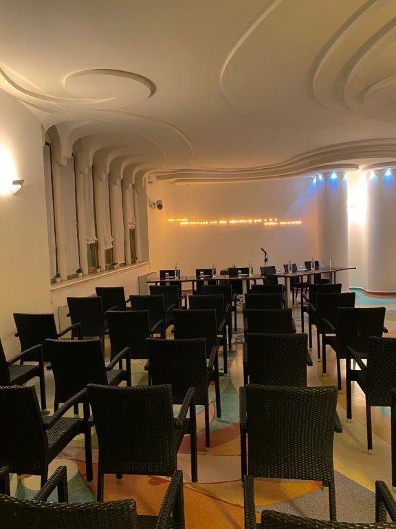 Sala polifunzionale “La Fleur“ di mq 180, è situata al piano terreno della struttura alberghiera, di forma non geometrica, con pavimento intarsiato di marmo e stucchi moderni alle pareti, adornate da giochi di luci; la stessa è dotata di ingresso autonomo indipendente e ingresso interno, completamente arieggiabile e dotata di notevole luce naturale diretta, avendo un’intera parete a finestre che s’affaccia sulla nostra terrazza di oltre 500 mq. Servizi privati.